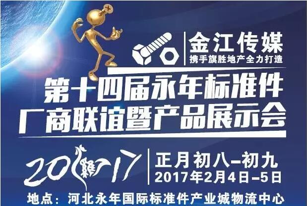 為加強(qiáng)全國標(biāo)準(zhǔn)件行業(yè)內(nèi)外交流和信息溝通,推動(dòng)永年標(biāo)準(zhǔn)件產(chǎn)業(yè)上檔升級(jí),宣傳推廣標(biāo)準(zhǔn)件產(chǎn)品和品牌,增進(jìn)標(biāo)準(zhǔn)件廠商信息交流和感情溝通,充分利用永年撤縣設(shè)區(qū)的大好發(fā)展機(jī)遇,邯鄲市金江傳媒廣告有限公司定于2017年2月4-5日(農(nóng)歷正月初八--初九)在中國永年國際標(biāo)準(zhǔn)件產(chǎn)業(yè)城物流區(qū)召開第十四屆中國•永年標(biāo)準(zhǔn)件廠商聯(lián)誼暨產(chǎn)品展示會(huì)。